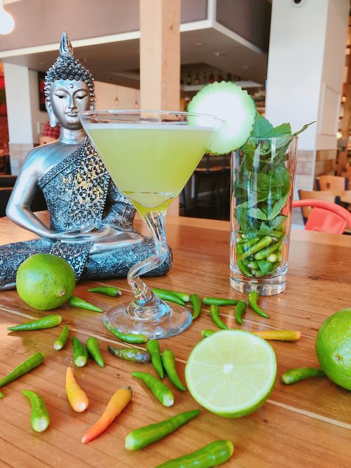 Exotico Tequila, passion fruit, galangal, keffir lime leaf, Thai chili, lime, simple syrup, chili rim